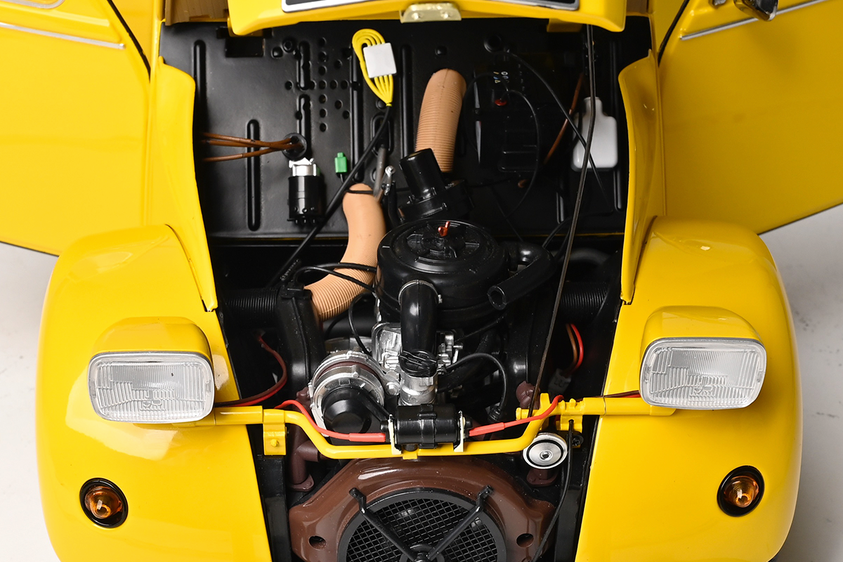 The hood opens to reveal the authentic 602 cc twin-cylinder engine