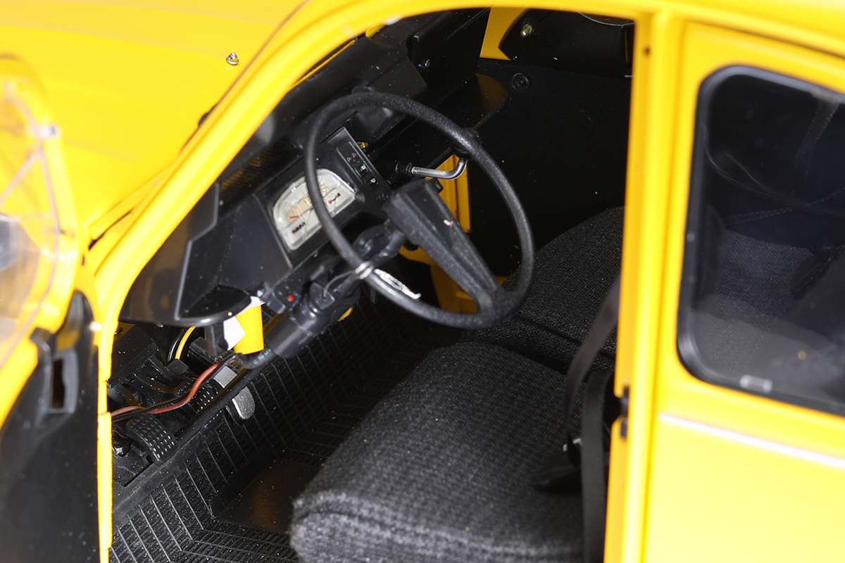 Recreate Melina Havelock's car as it appeared at the beginning of the chase when she and 007 jumped into the little yellow car and sped away from Hector Gonzalez's men. Her car at this point was in pretty good condition and as yet undamaged.