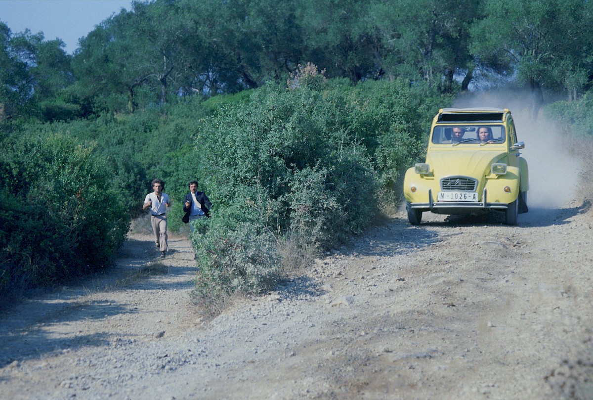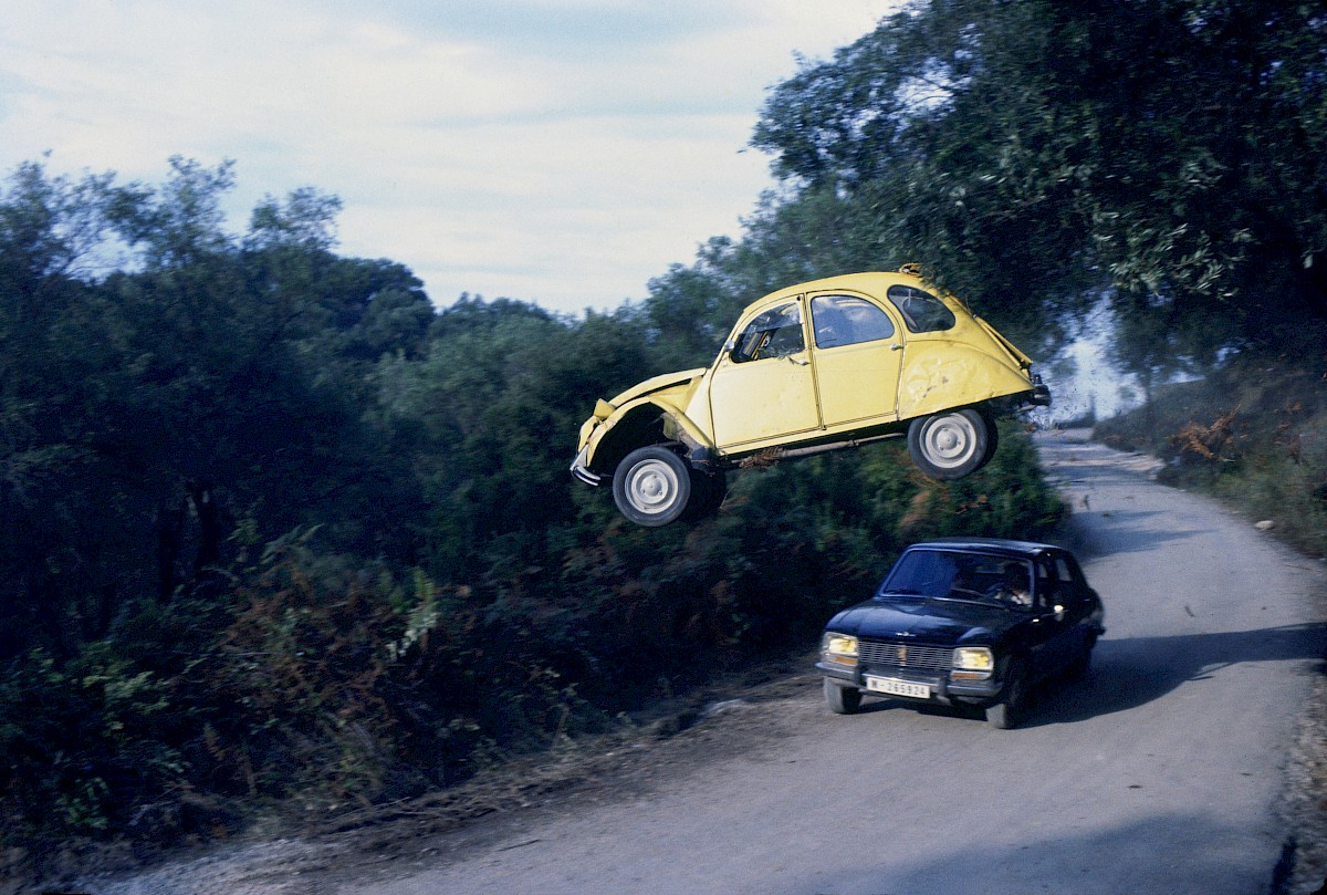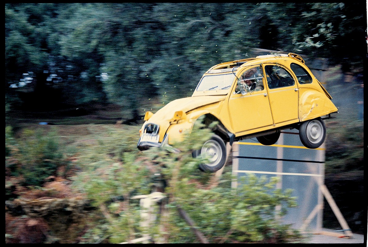 The low-power, low-cost Citroën 2CV was a staple of French life, developed for rural transportation. By the 1970s, the 2CV was powered by a 602cc flat-twin engine mustering around 33 bhp. The main hero vehicle used in filming featured a larger 1.1-litre engine that was lifted from the Citroën GS. Shot in Corfu over 12 days in late September and early October 1980, the chase sequence marked the franchise debut of Remy Julienne as stunt driver and arranger. A number of 2CVs were used in the sequence and four are known to have survived filming, while at least two more were definitely scrapped after the production wrapped.