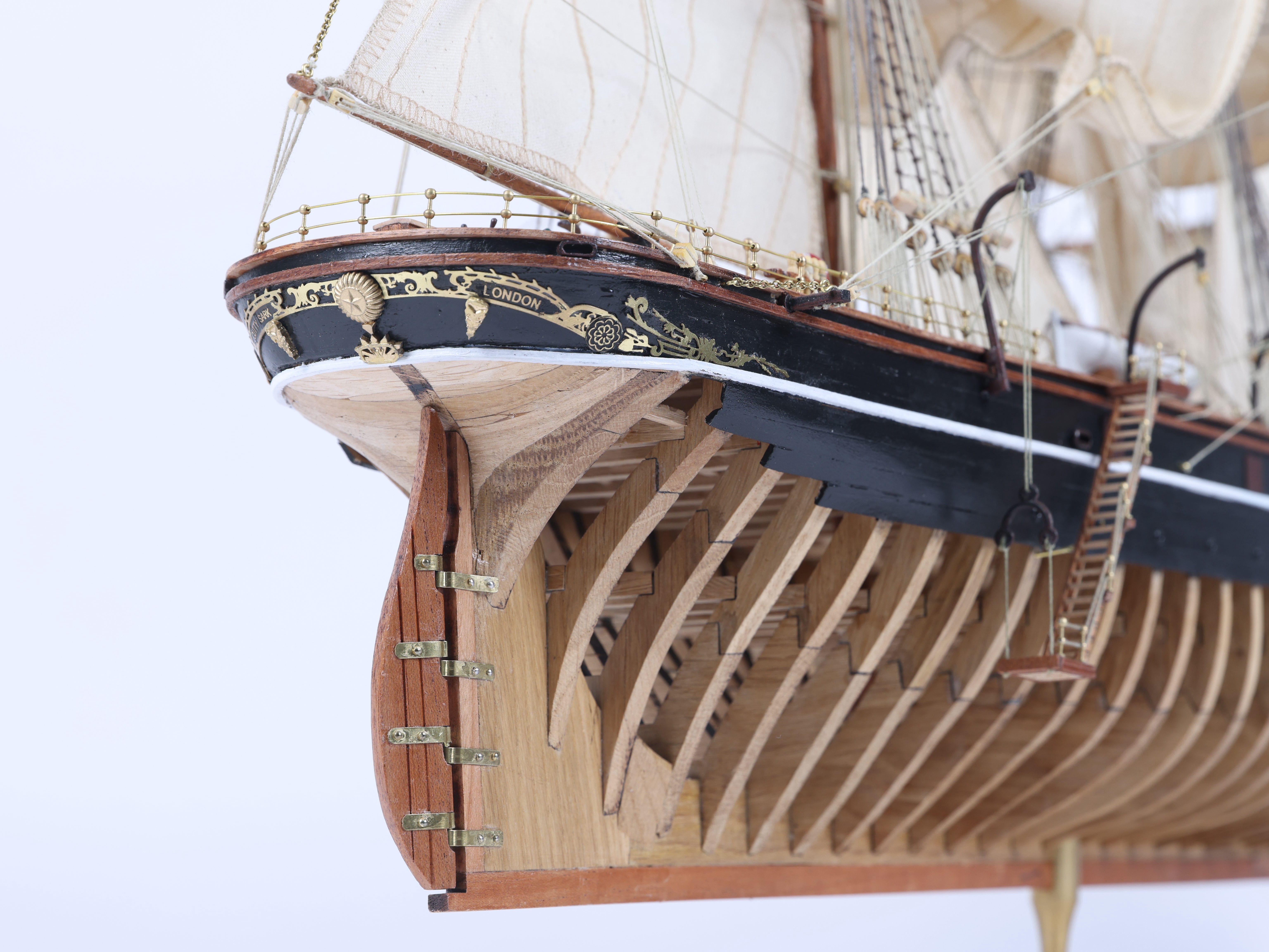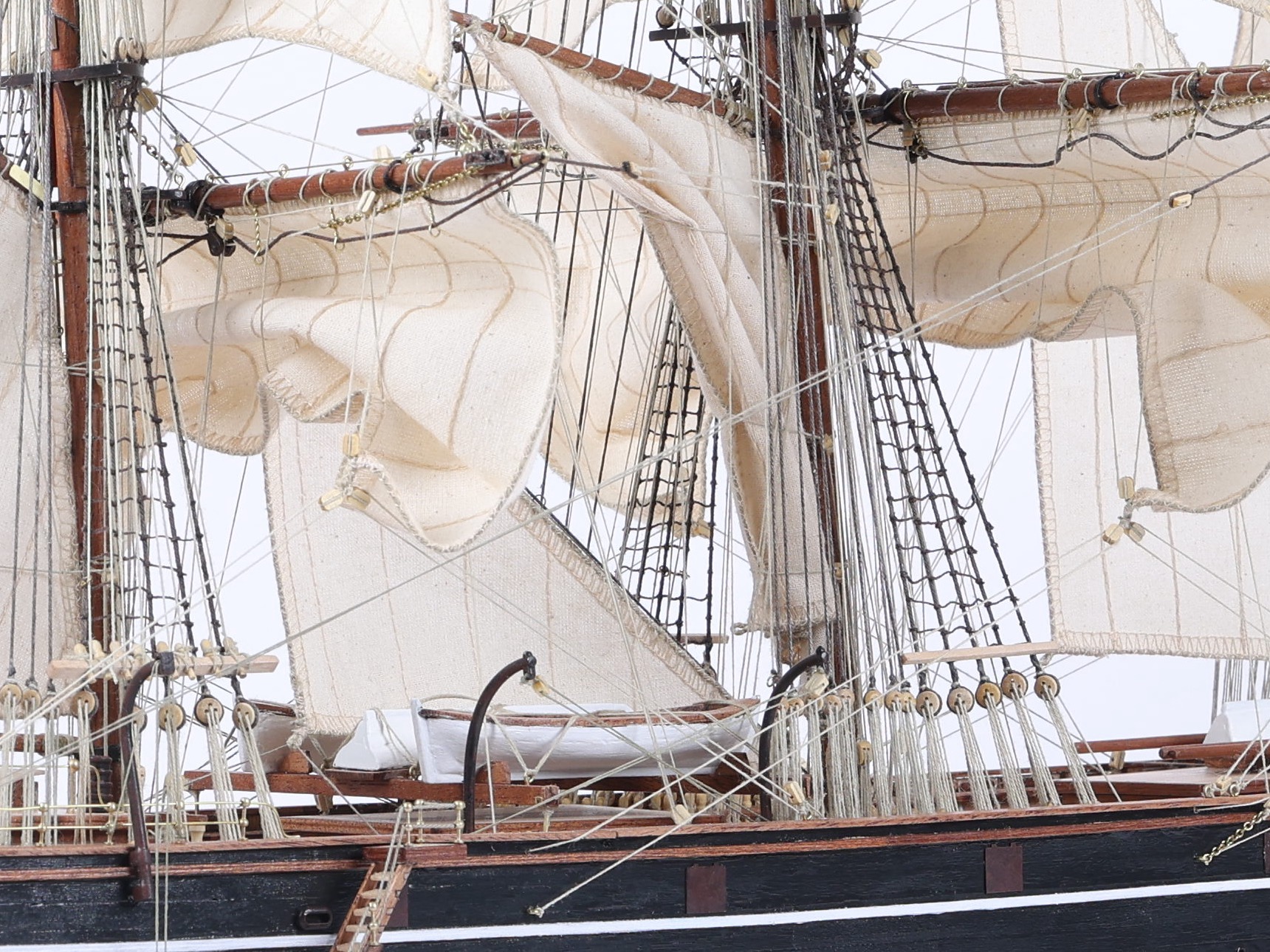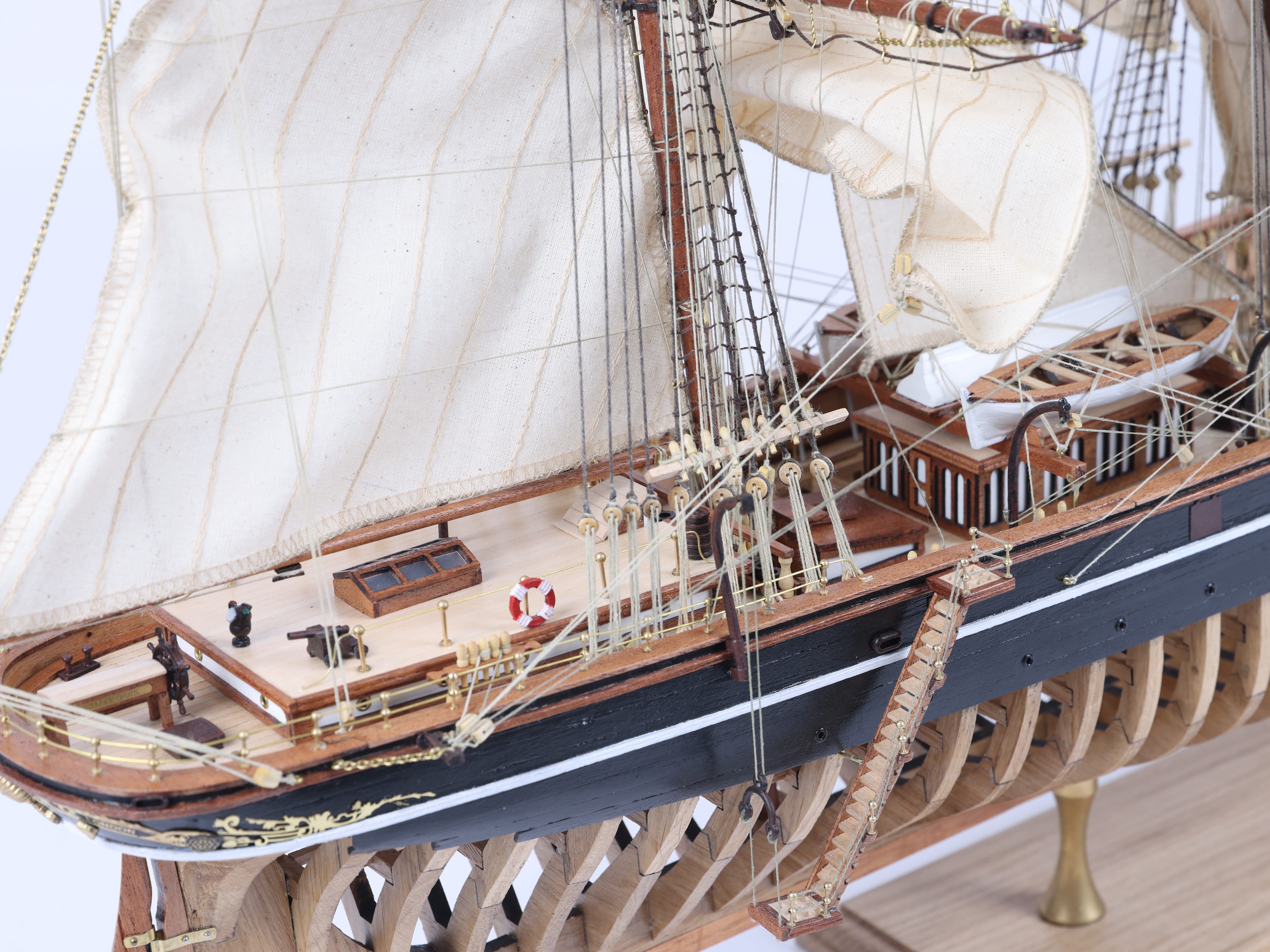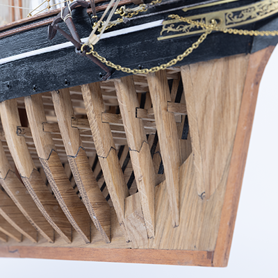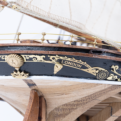 Crafted at 1:75 scale, this model has been created in the most extraordinary detail, with opened hand-sewn cotton sails, rigging from braided cotton threads of different thicknesses, plus a solid oak display stand.