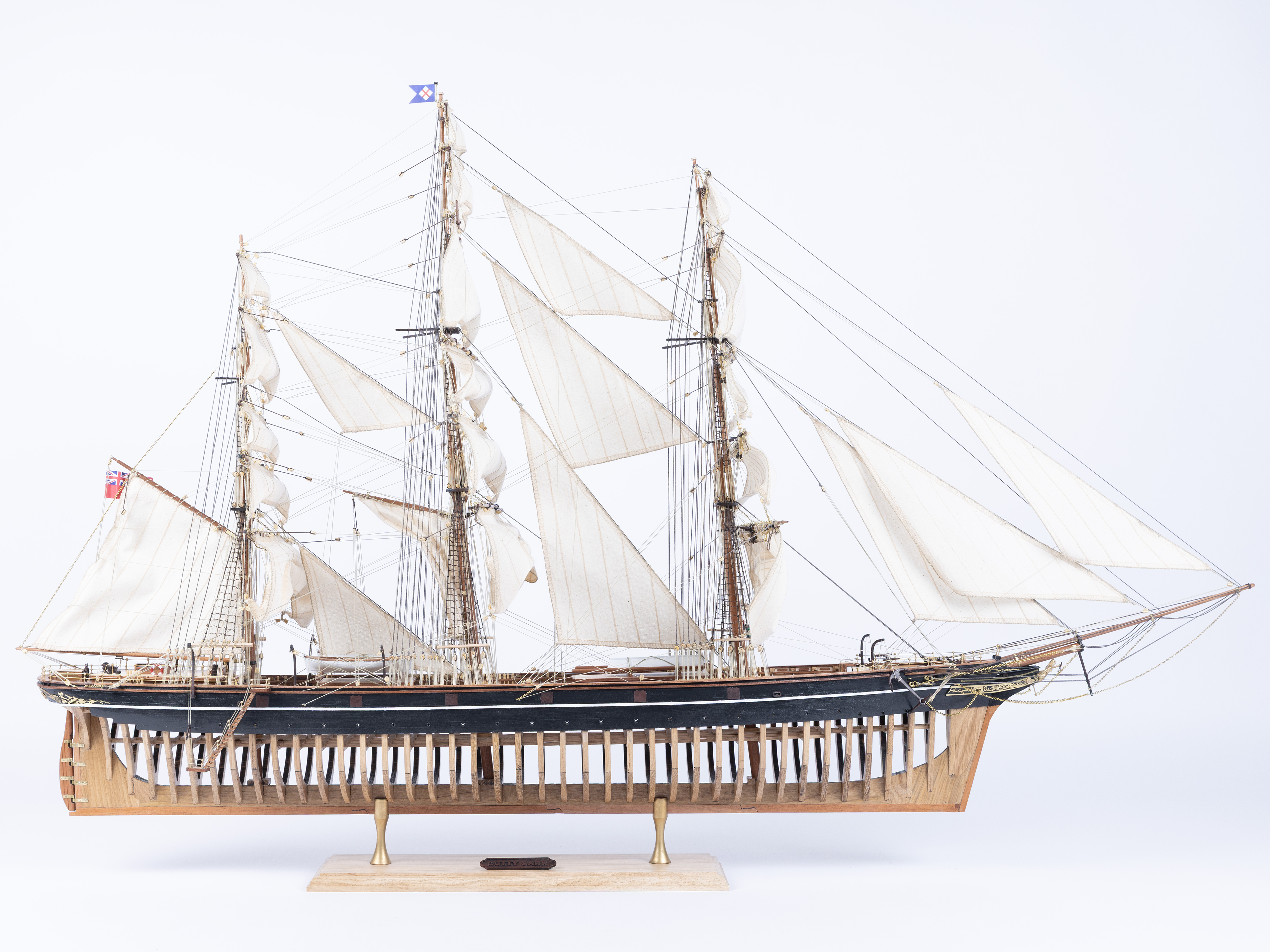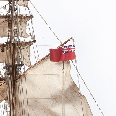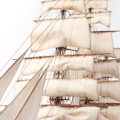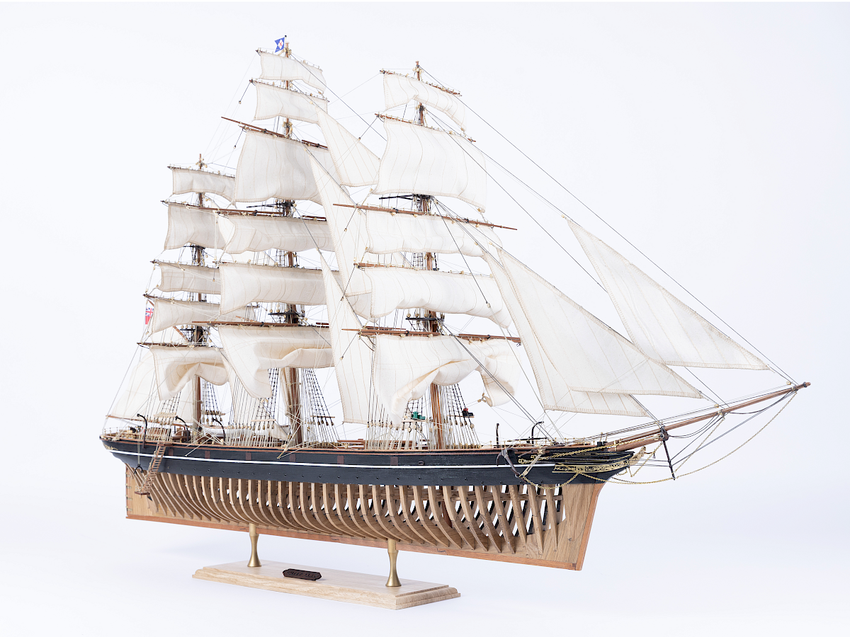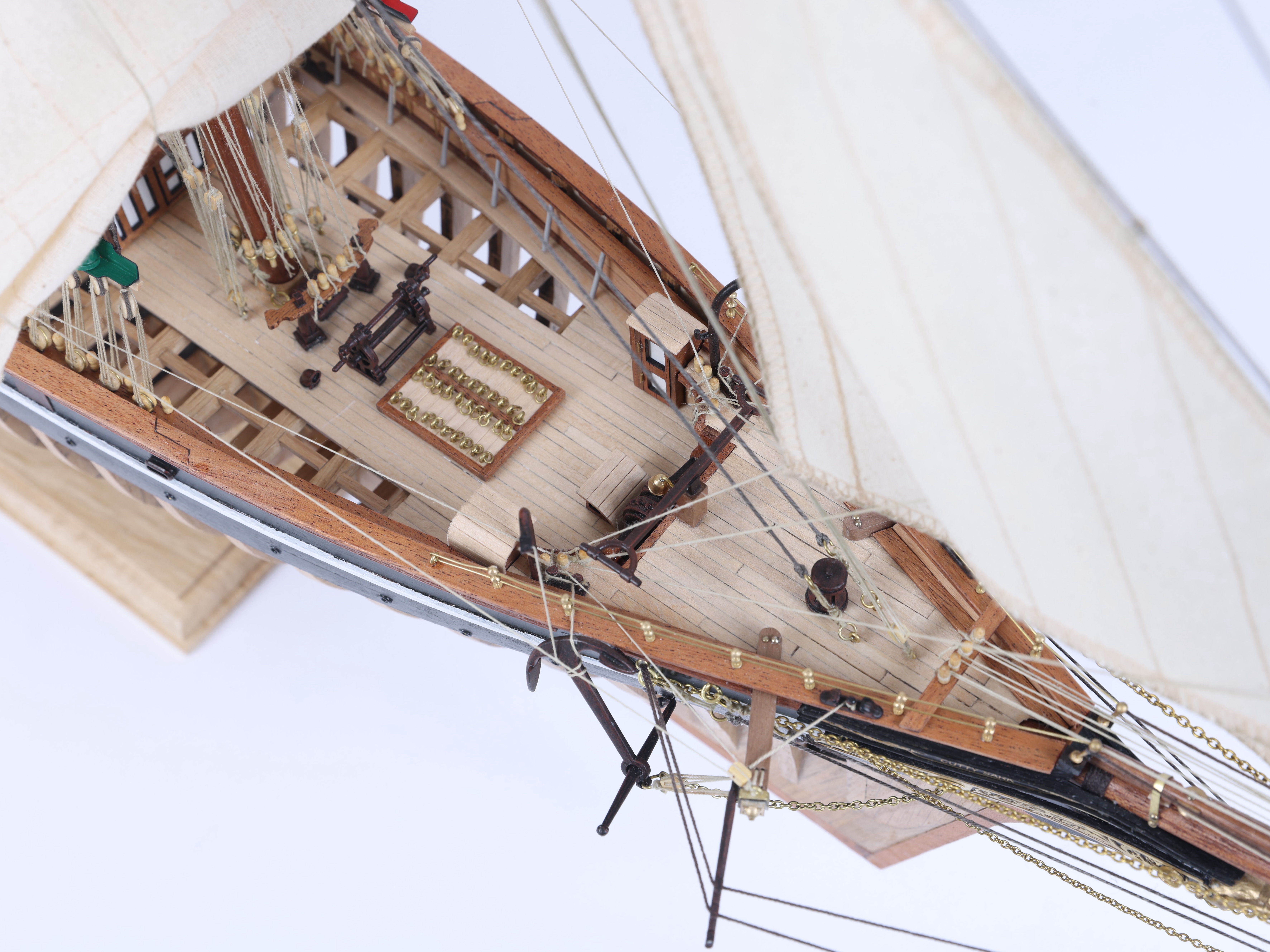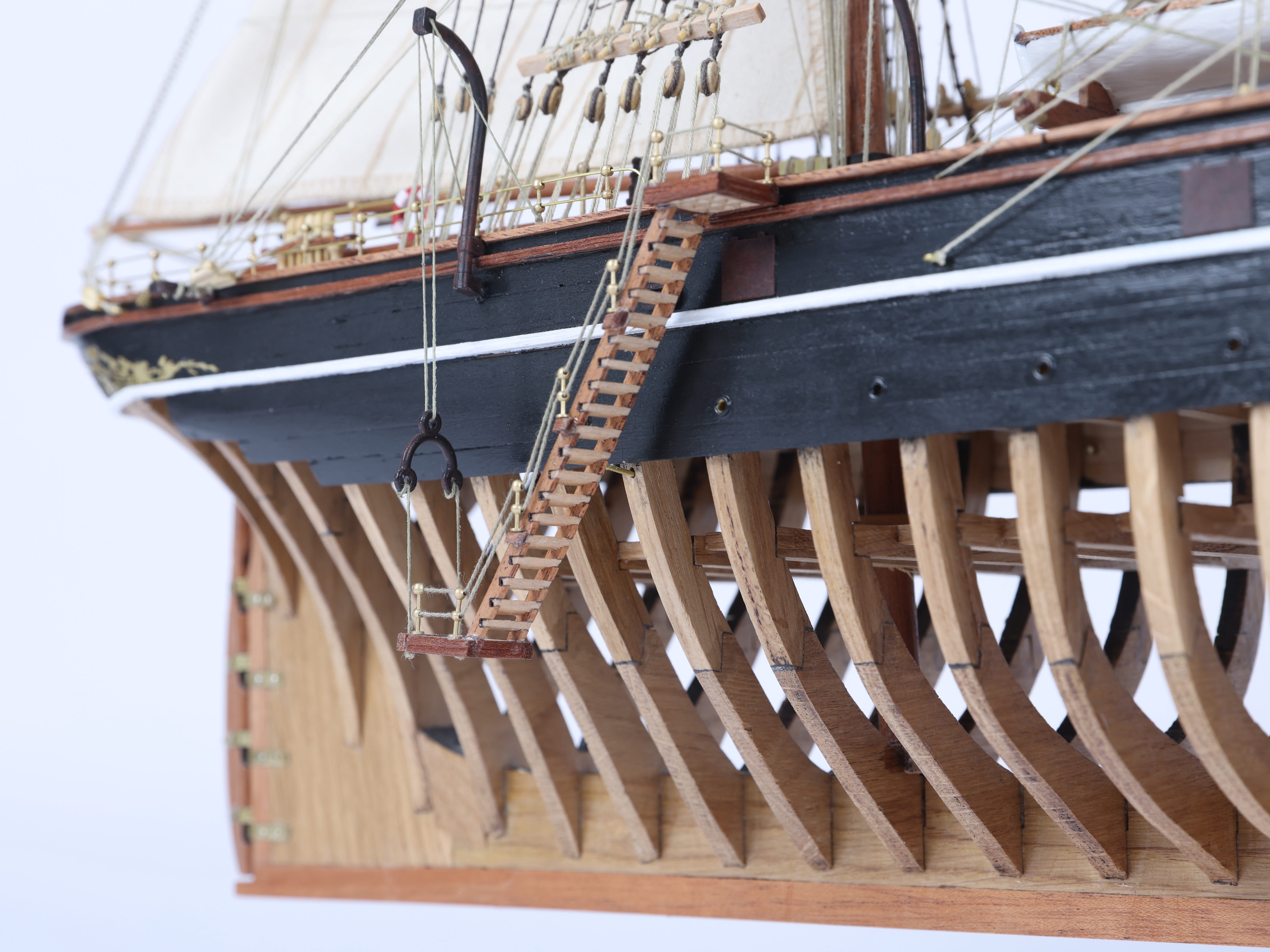 Crafted at 1:75 scale, this model has been created in the most extraordinary detail, with opened hand-sewn cotton sails, rigging from braided cotton threads of different thicknesses, plus a solid oak display stand.