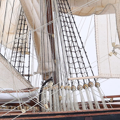 Full cotton rigging kit, sails hand-sewn with bolt ropes, dyed, and braided threads.