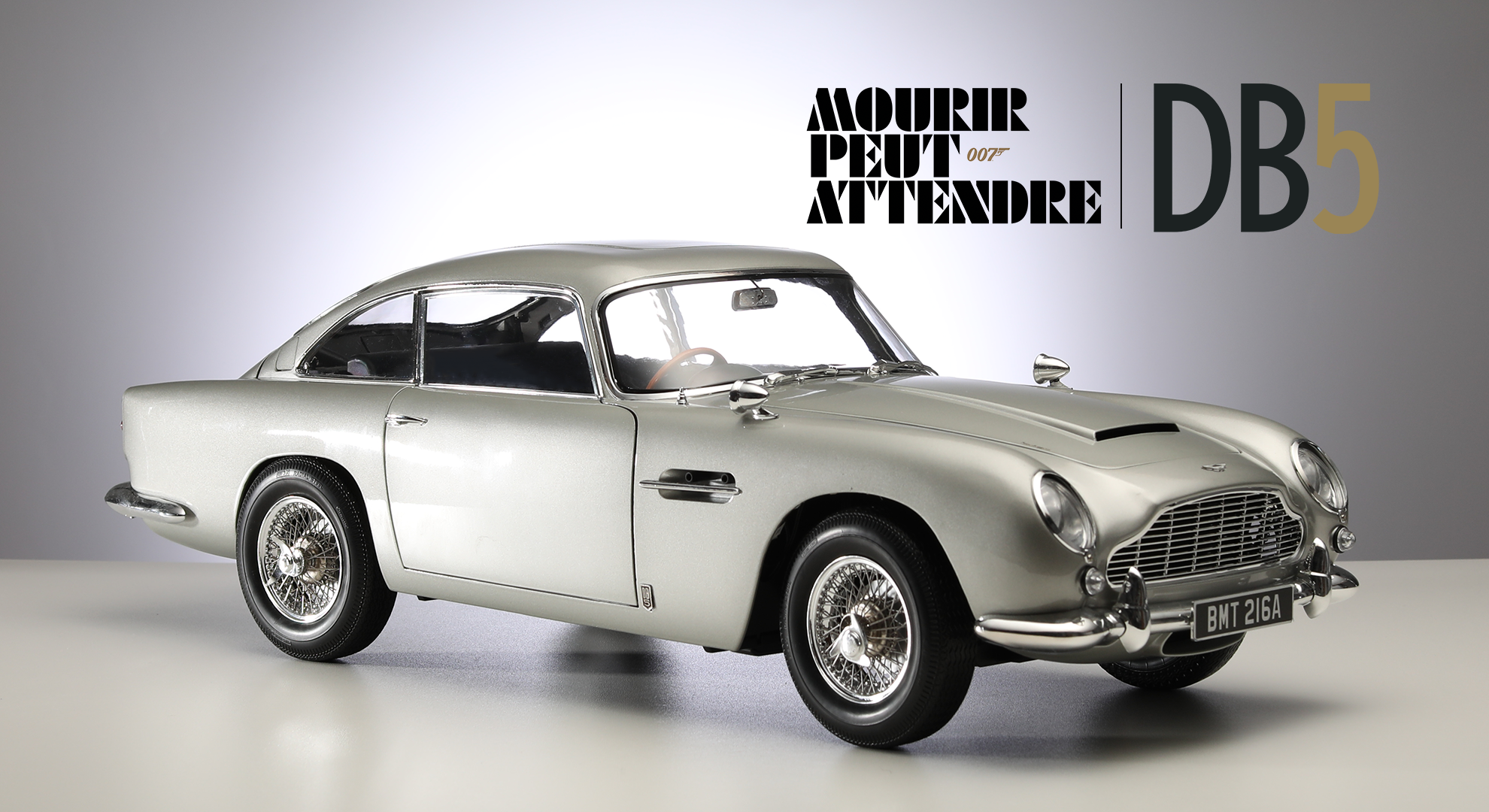 Notre Aston Martin DB5 à l'échelle 1/8 comprend tous les gadgets présentés dans le 25ème film de Bond Mourir peut attendre, à savoir sa plaque d'immatriculation interchangeable, apparue pour la première fois dans Goldfinger en 1964, bien qu'elle soit équipée d'un écran LED dans cette dernière version.