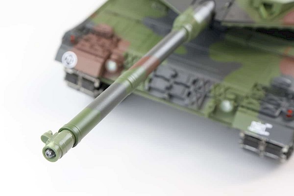 Our 1:16 big-scale model of this world-class MBT measures 68.5 cm (27 in) in length, is operated by remote control and features moving sprockets and tracks made up of individual metal links, 360° rotating turret, elevating main gun, machine gun & engine sound, exhaust smoke, and infrared target. It replicates every detail of the armoured protection, fire power and manoeuvrability of the outstanding, real-life machine.